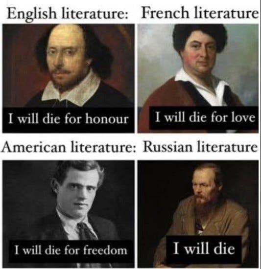 My 19-year-old daughter asked me for some book suggestions tonight. I’ve arranged all my Russian authored books on a shelf and she looked at those and said, “But not a Russian book,” and then showed me this: